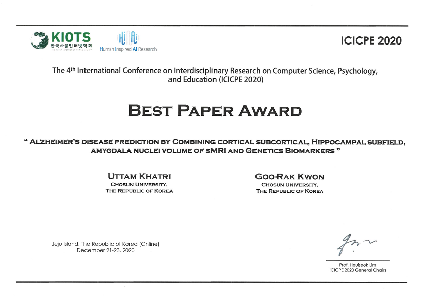News ICICPE 우수논문상 수상 (2020년 12월 21-23일) Prof. Goo-Rak Kwon, Ph.D. 2021. 5. 16. 15:15 공유하기 게시글 관리 Lab. for Digital Media Computing 저작자표시 비영리 변경금지 (새창열림) 'News' Related Articles The elevation to IEEE Senior Member grade 한국멀티미디어학회 우수논문상 (2021년 4월 30일) [공지] 학부연구생, 석박사대학원생 모집 공고 조선대학교, 과기부 기초연구실지원사업 선정